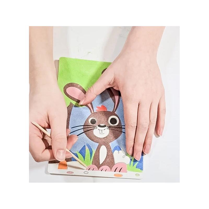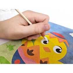 Dziecko krok po kroku odsłania fragmenty samoprzylepnego szablonu i posypuje je kolorowym piaskiem, tworząc barwne wielkanocne ilustracje.