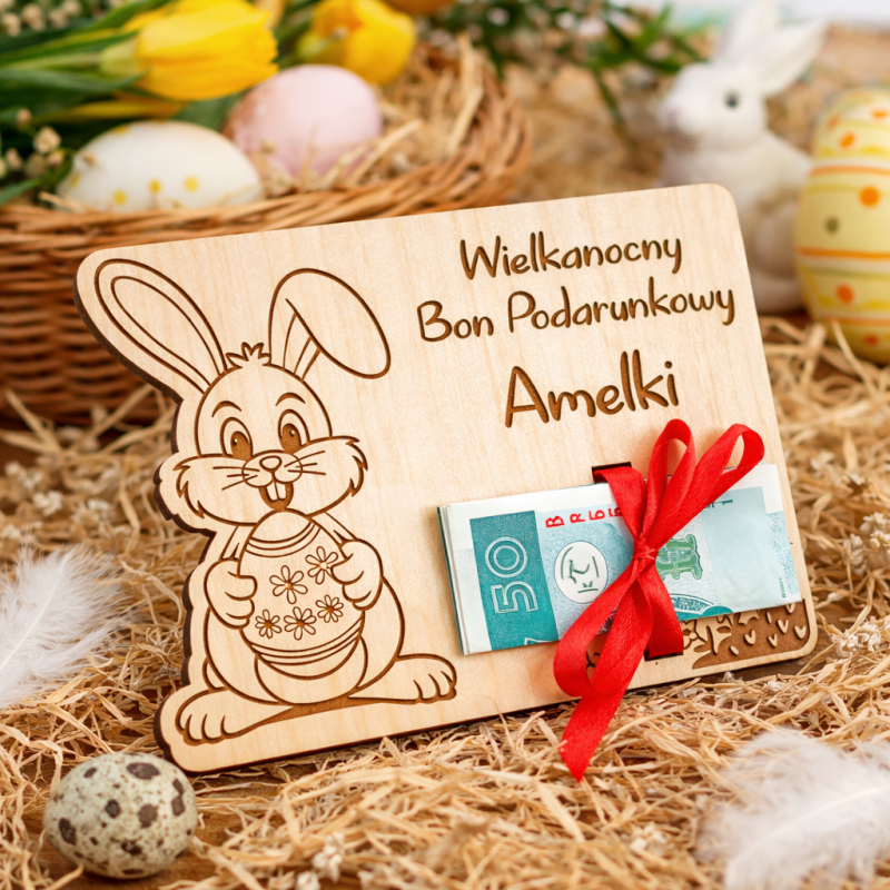Drewniany bon wielkanocny na pieniądze z grawerowanym imieniem