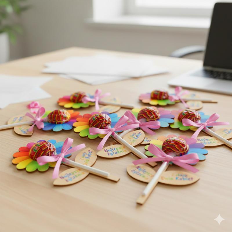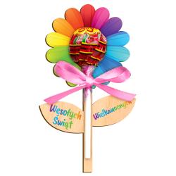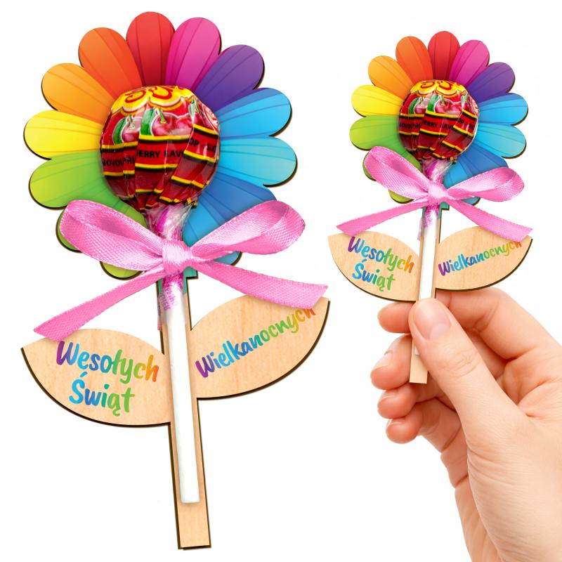 Kolorowy kwiatek na lizaka to uroczy i słodki upominek wielkanocny dla dzieci.