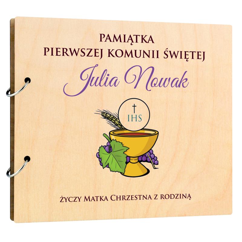 Drewniany album z kielichem pamiątka Pierwszej Komunii Świętej