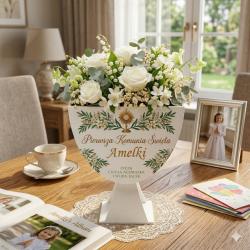 Elegancki kielich flowerbox na Komunię z personalizacją to wyjątkowa dekoracja i oryginalny pomysł na prezent z okazji Pierwszej Komunii Świętej. Subtelna grafika oraz starannie dobrane detale tworzą spójną i uroczystą kompozycję.