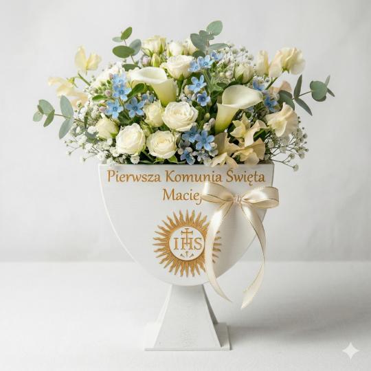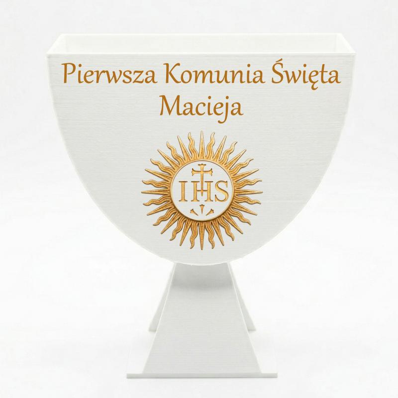 Elegancki kielich flowerbox na Komunię z imieniem dziecka to wyjątkowa dekoracja, która doskonale podkreśla charakter uroczystości Pierwszej Komunii Świętej. Prosty i nowoczesny design w połączeniu ze złotymi detalami tworzy stylową i ponadczasową formę.
