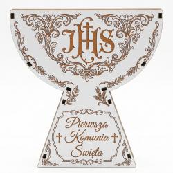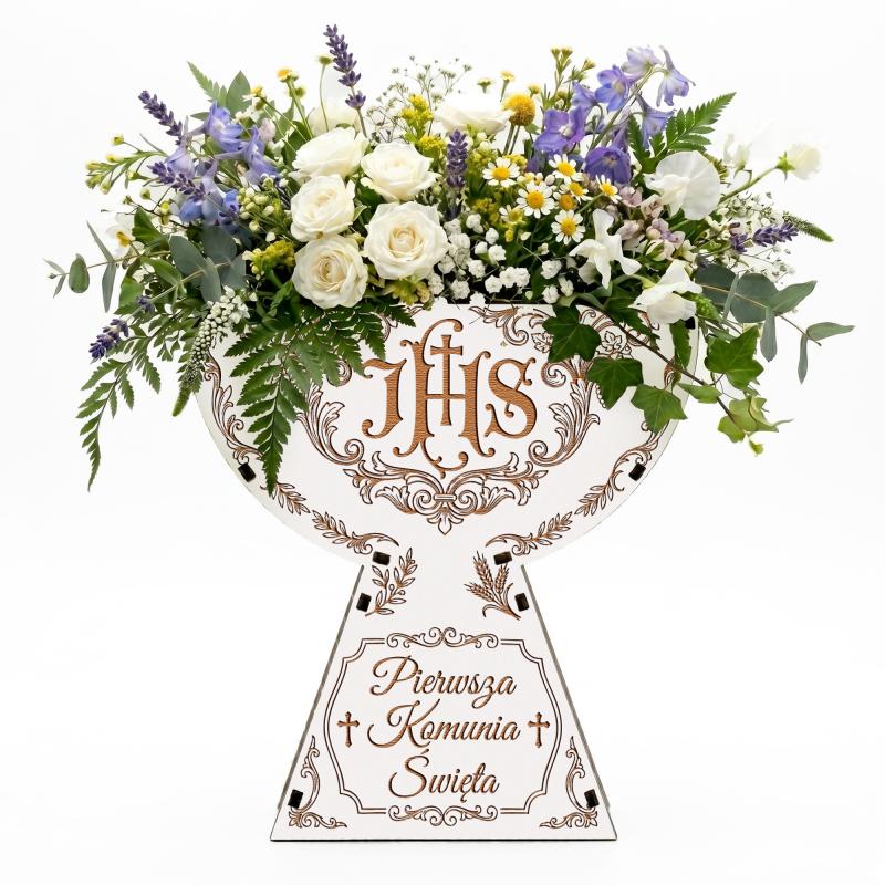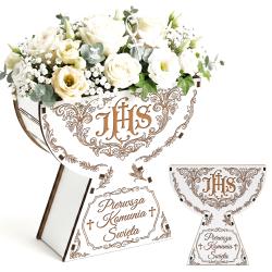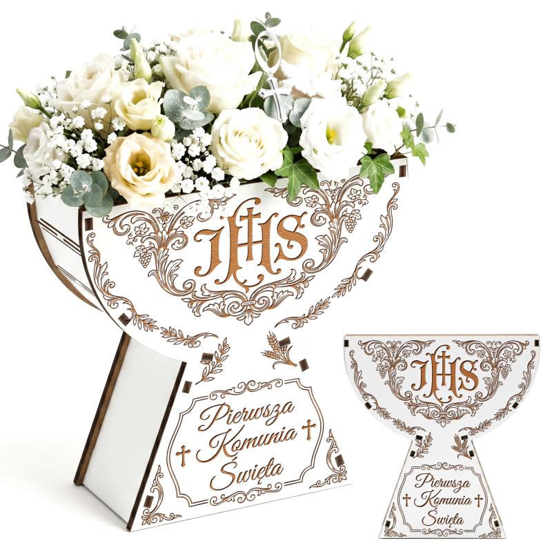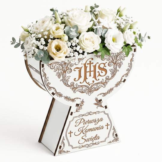 Flowerbox komunijny z grawerem IHS to elegancka i ponadczasowa dekoracja, która doskonale podkreśla uroczysty charakter Pierwszej Komunii Świętej. Precyzyjny grawer religijny z symbolem IHS oraz ozdobnymi ornamentami nadaje całości wyjątkowy i klasyczny wygląd.