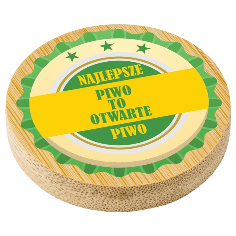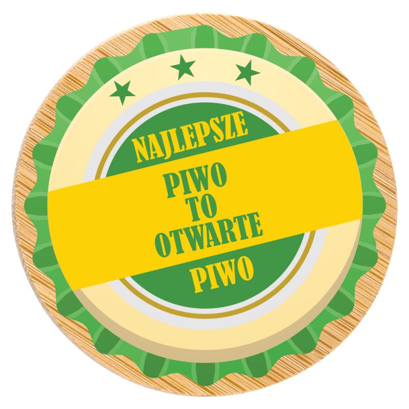 Drewniany otwieracz z magnesem i napisem "Najlepsze piwo to otwarte piwo". Praktyczny prezent dla fana piwa na urodziny, wieczór kawalerski i inne okazje.