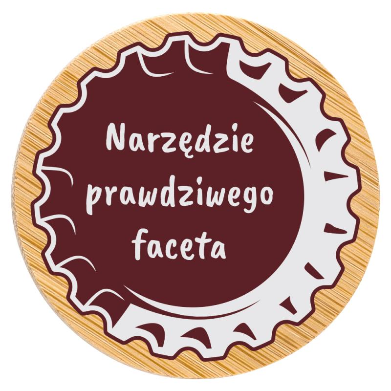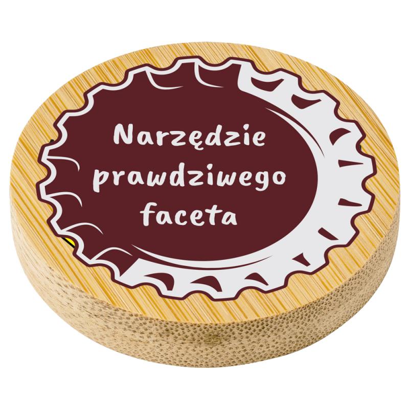 Drewniany otwieracz z magnesem i napisem "Narzędzie prawdziwego faceta". Praktyczny prezent dla fana piwa na urodziny, wieczór kawalerski i inne okazje.