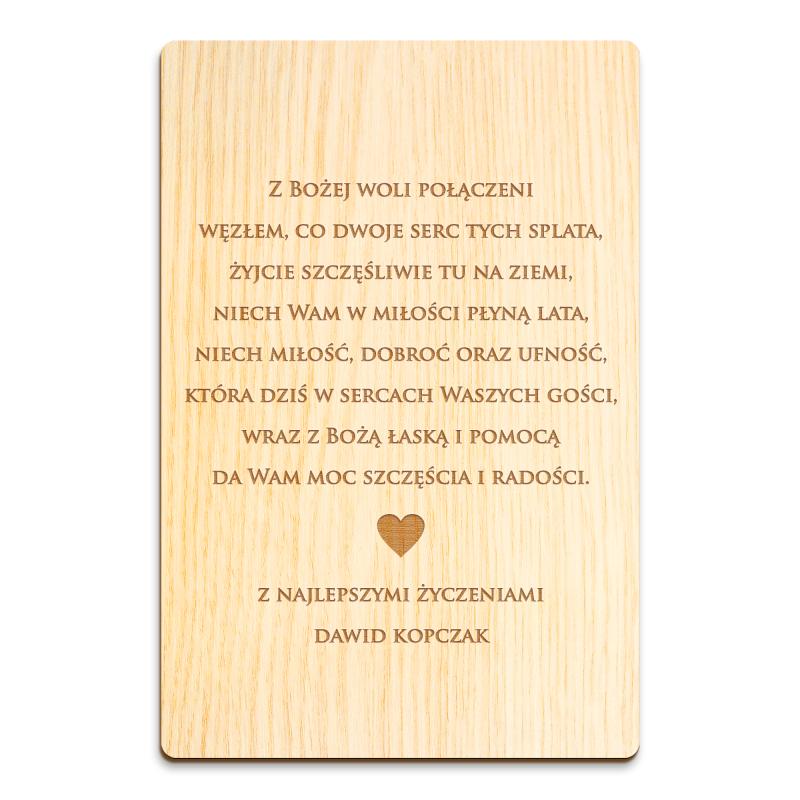 Drewniana kartka ślubna to elegancki sposób na przekazanie gratulacji oraz stanowi piękną pamiątkę na całe życie. Idealna na każdą okazję związaną ze ślubem, a jej unikalny design sprawi, że na pewno zostanie zapamiętana.