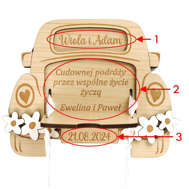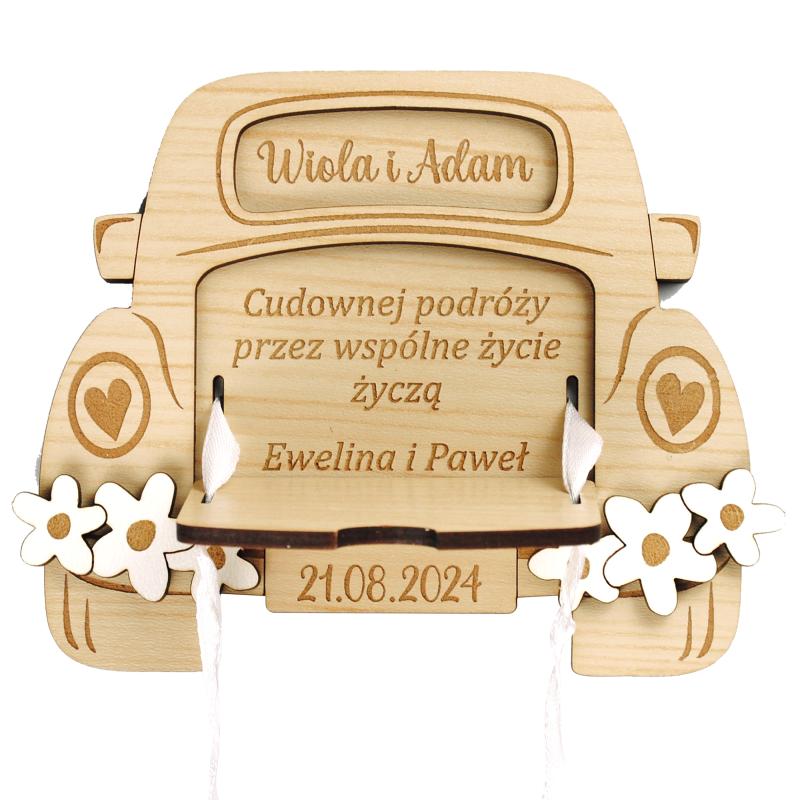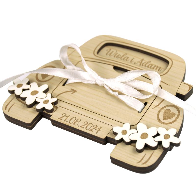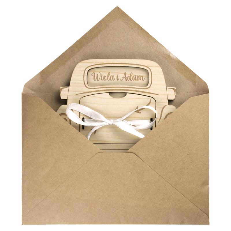 Ta piękna kartka ślubna w kształcie samochodu to idealny sposób na wyrażenie gratulacji dla pary młodej. Wykonana z naturalnego drewna, łączy w sobie elegancję, unikalny design oraz trwałość, tworząc niezapomnianą pamiątkę z wyjątkowego dnia.