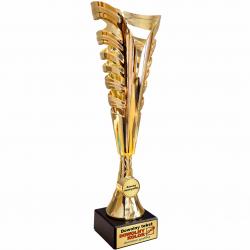 Elegancki złoty puchar o nowoczesnym, dynamicznym kształcie na czarnej marmurowej podstawie. Doskonała nagroda na turnieje, zawody sportowe i konkursy.