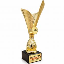 Elegancki złoty puchar o nowoczesnym, dynamicznym kształcie na czarnej marmurowej podstawie. Doskonała nagroda na turnieje, zawody sportowe i konkursy.