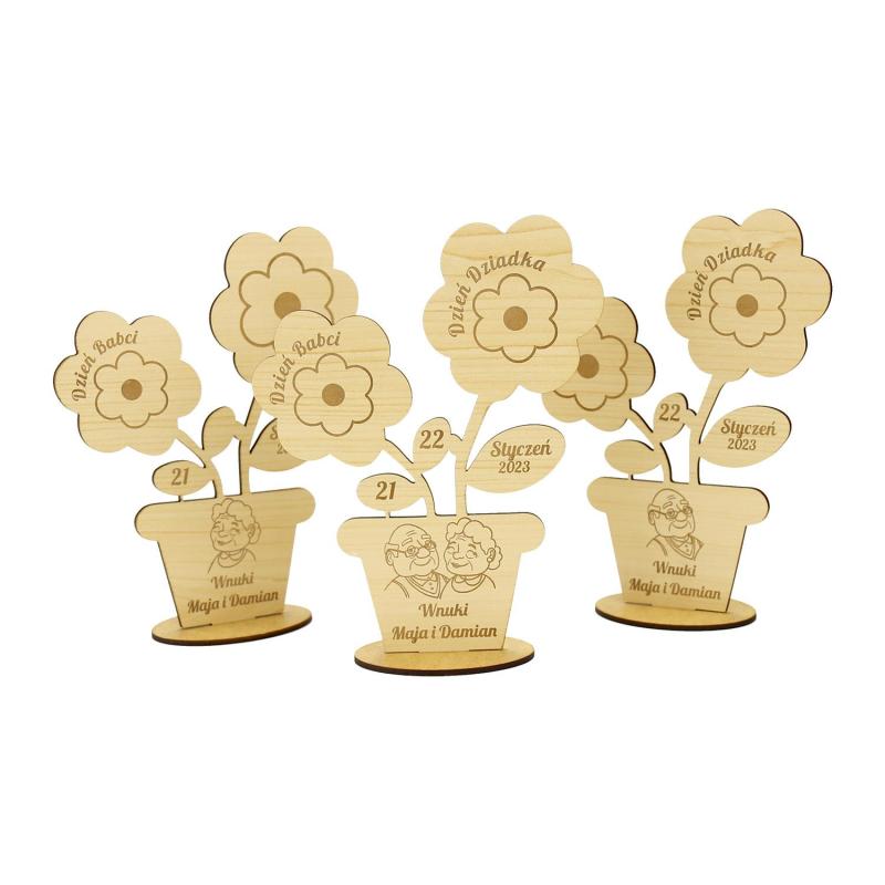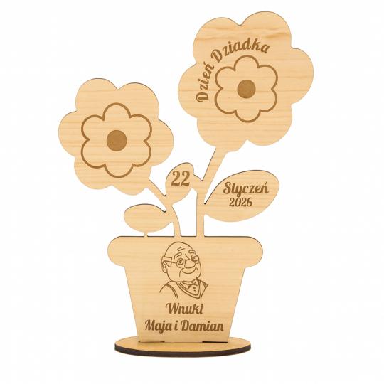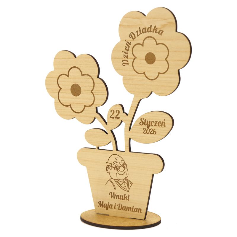 Drewniana statuetka dla Dziadka – kwiatek do kolorowania to piękny, osobisty prezent przygotowany specjalnie na Dzień Dziadka. Grawerowane napisy Dzień Dziadka, data oraz imiona wnuków nadają całości wyjątkowy, pamiątkowy charakter.