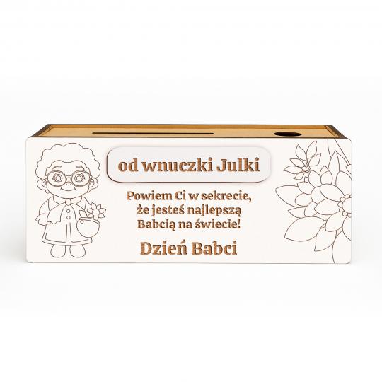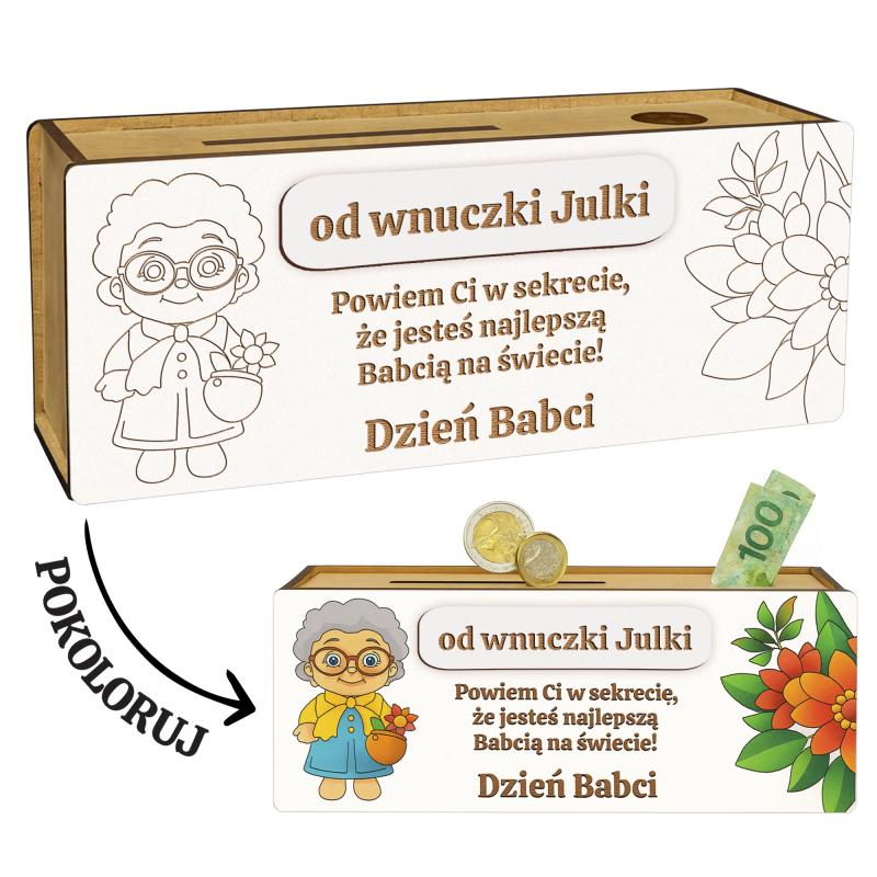 Drewniana skarbonka do kolorowania to uroczy i kreatywny prezent z okazji Dnia Babci. Grawerowane ilustracje można wypełnić kolorami według własnego pomysłu, dzięki czemu skarbonka staje się wyjątkową, osobistą pamiątką.