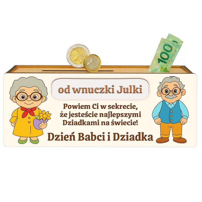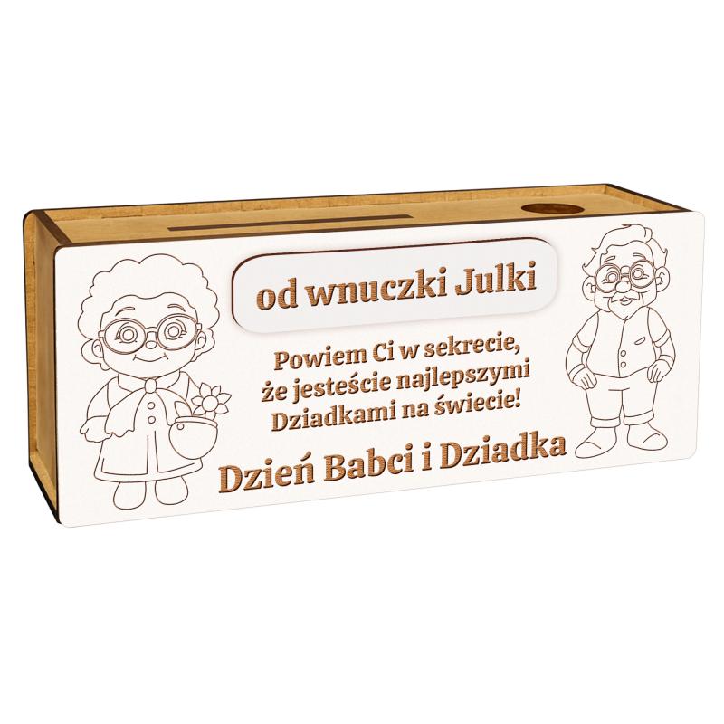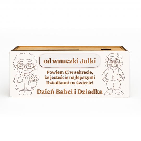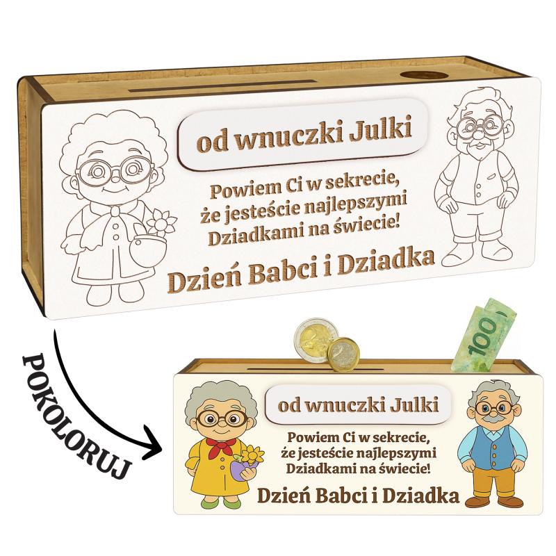 Drewniana skarbonka do kolorowania to wyjątkowy i kreatywny upominek na Dzień Babci i Dziadka. Grawerowane ilustracje Babci i Dziadka można samodzielnie pokolorować — kredkami, flamastrami, farbami czy pisakami. Dzięki temu każda skarbonka staje się jedyna w swoim rodzaju i pełna dziecięcej kreatywności.