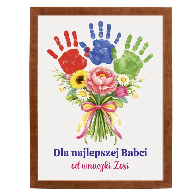 Napis umieszczony na grafice wykonujemy my, co zapewnia estetyczny i czytelny efekt oraz sprawia, że całość jest gotowa do wręczenia. Połączenie własnoręcznie pomalowanych dłoni z profesjonalnie wykonanym napisem tworzy wzruszającą pamiątkę od wnuków.