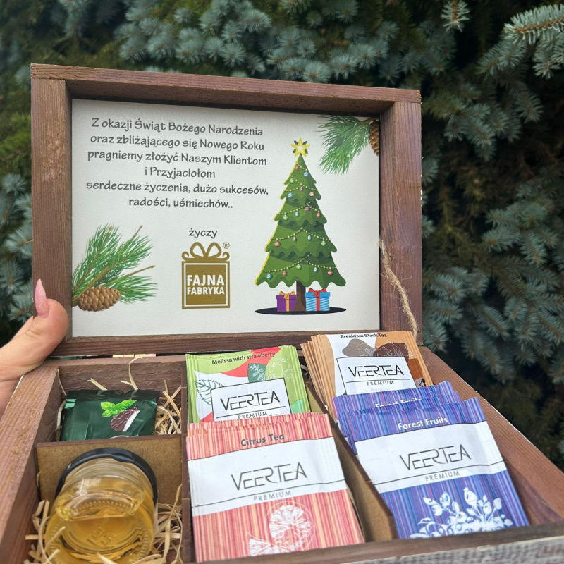 Ten elegancki zestaw prezentowy w drewnianej skrzynce to doskonały firmowy upominek na Święta Bożego Narodzenia, który ucieszy każdego obdarowanego. Skrzynka z indywidualną dedykacją w środku dodaje osobistego akcentu, czyniąc ten prezent wyjątkowym. To idealne połączenie elegancji i smaku, które wprowadzi w świąteczny nastrój i zostawi trwałe, pozytywne wrażenie.