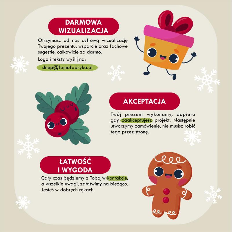 "Grafika" – Możemy dodać Twoje logo w wybranym miejscu kartki. Najlepiej przesłać logo w formacie CDR, EPS, AI, SVG, PDF lub JPG. - Prześlij swoje logo i tekst – Podczas zakupu możesz dodać swoje logo oraz treść życzeń w polach personalizacji, a jeśli wolisz, możesz je wysłać na nasz adres e-mail sklep@fajnafabryka.pl