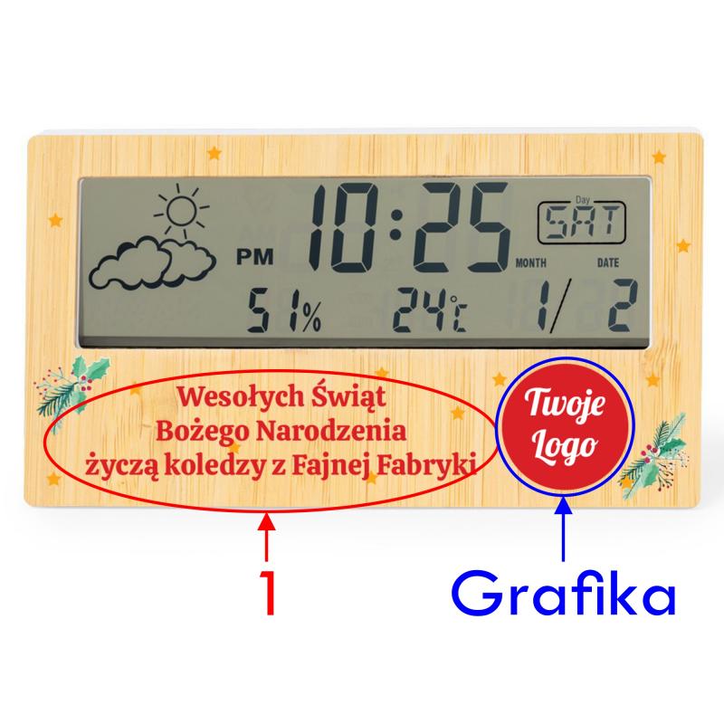Nowoczesna stacja pogodowa z personalizacją to praktyczny i elegancki gadżet, który doskonale sprawdzi się zarówno w domu, jak i w biurze. Wyposażona w zegar, kalendarz, alarm, termometr i higrometr, umożliwia codzienne monitorowanie warunków w pomieszczeniu.