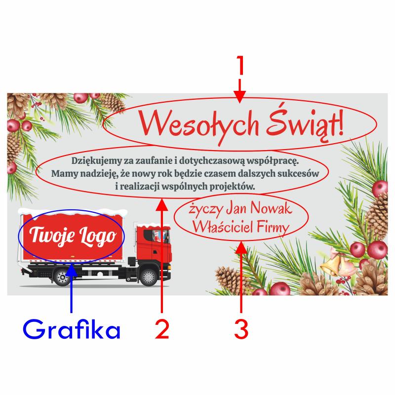 "Grafika" – Możemy dodać Twoje logo w wybranym miejscu kartki. Najlepiej przesłać logo w formacie CDR, EPS, AI, SVG, PDF lub JPG. - Prześlij swoje logo i tekst – Podczas zakupu możesz dodać swoje logo oraz treść życzeń w polach personalizacji, a jeśli wolisz, możesz je wysłać na nasz adres e-mail sklep@fajnafabryka.pl