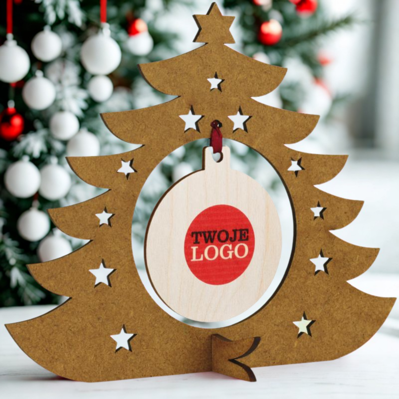 Statuetka choinka z bombką i logo firmy na Boże Narodzenie