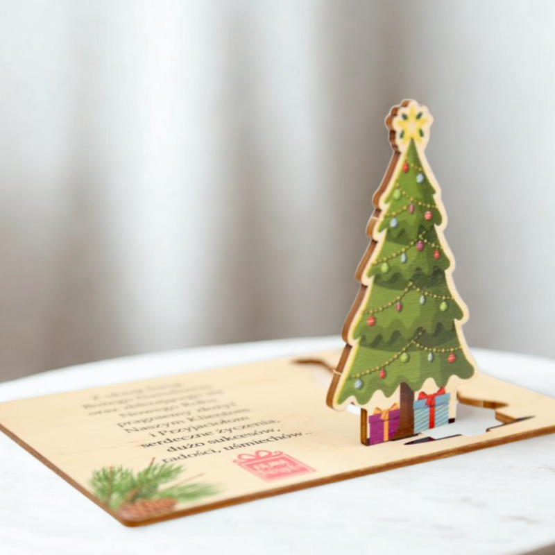 Firmowe kartki świąteczne z drewna MDF to wyjątkowy produkt, który łączy elegancję, jakość oraz możliwość pełnej personalizacji. Dzięki zastosowaniu technologii druku UV, kartki są trwałe i zachowują swój wygląd przez wiele lat. To idealny wybór dla firm, które chcą wyrazić wdzięczność i złożyć świąteczne życzenia w wyjątkowy sposób. Zachęcamy do skorzystania z naszej oferty i zamówienia kartek, które oddadzą pełnię świątecznego klimatu i profesjonalizmu Twojej firmy. Możliwość dokupienia dopasowanej koperty zapewnia eleganckie wręczenie kartki.