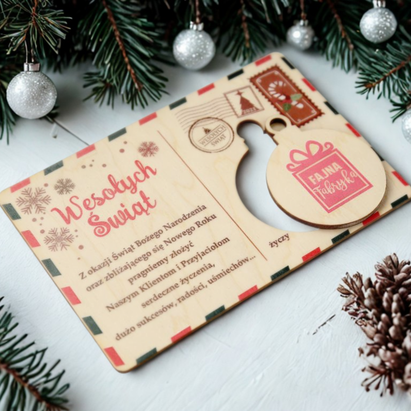 Personalizowana kartka świąteczna z bombką i logo firmy na prezent