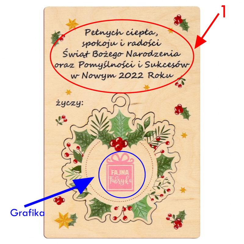"Pole nr 1" – Umieścimy dowolne życzenia, sentencję lub wierszyk wraz z końcowym podpisem.