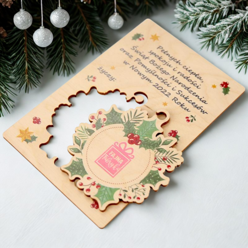 Firmowe kartki świąteczne z drewna MDF to wyjątkowy produkt, który łączy elegancję, jakość oraz możliwość pełnej personalizacji. Dzięki zastosowaniu technologii druku UV, kartki są trwałe i zachowują swój wygląd przez wiele lat. To idealny wybór dla firm, które chcą wyrazić wdzięczność i złożyć świąteczne życzenia w wyjątkowy sposób. Zachęcamy do skorzystania z naszej oferty i zamówienia kartek, które oddadzą pełnię świątecznego klimatu i profesjonalizmu Twojej firmy. Możliwość dokupienia dopasowanej koperty zapewnia eleganckie wręczenie kartki.