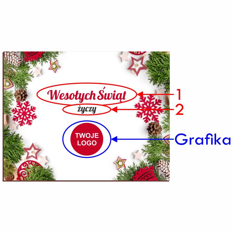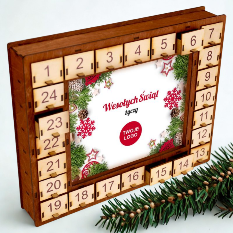 Kalendarz składa się z 24 zamykanych okienek, w których można umieścić drobne upominki, słodycze lub liściki z miłymi życzeniami. Centralna część kalendarza umożliwia personalizację – można dodać własne logo, zdjęcie lub dedykację, co czyni go idealnym pomysłem na prezent firmowy lub rodzinny.