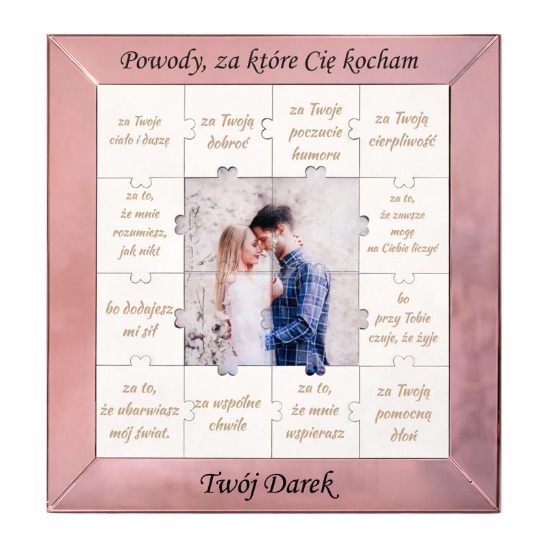Prezent na Walentynki powody miłości w formie puzzli ze zdjęciem z lustrzano różowej ramie