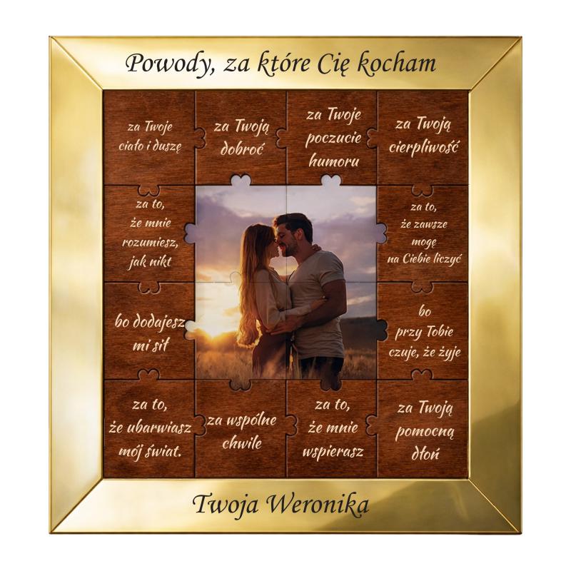 Przedstawiamy wyjątkowy, personalizowany prezent, który zachwyci każdą ukochaną osobę – romantyczny foto-puzzle z powodami miłości w lustrzanej, złotej ramie. Ten elegancki i sentymentalny upominek łączy w sobie personalizowane elementy z wybranym przez Ciebie zdjęciem i uroczymi przesłaniami, które wyrażają, dlaczego kochasz swojego partnera/kę. Każda puzzle to fragment mozaiki uczuć, tworząc razem kompletny obraz Twoich emocji. Na dolnej części znajduje się miejsce na własną dedykację lub imię, dodając osobisty akcent. Jest to idealna, pamiątkowa rzecz, która nie tylko stanowi romantyczną zabawę, ale także służy jako trwałe świadectwo miłości.