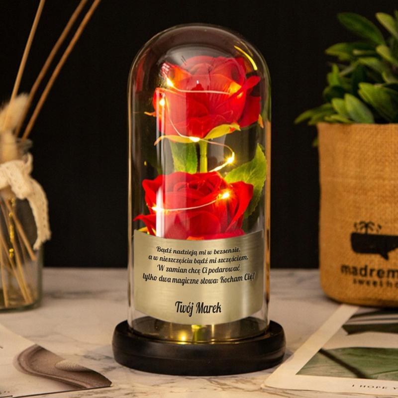 Elegancka dekoracja z różami i oświetleniem LED to niezwykle romantyczny i pełen uroku prezent na Walentynki. Szklana kopuła, w której umieszczono piękne róże, subtelnie podświetlone delikatnym światłem, tworzy wyjątkowy klimat.