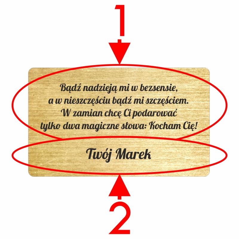 To pole jest przeznaczone na wiersz, cytat lub życzenia. Pamiętaj, aby tekst nie był za długi, ponieważ zmieni się układ tekstu, a to wpłynie na jego rozmiar. Tekst, który widzisz na zdjęciu, jest standardowy. Jeśli chcesz, aby taki pozostał oznacz w tym miejscu "Tekst bez zmian". Jeżeli chcesz inny, wpisz go w tym miejscu. Jeżeli chcesz zostawić to miejsce puste, oznacz w tym miejscu "Nie chcę personalizować tego pola (brak tekstu)".