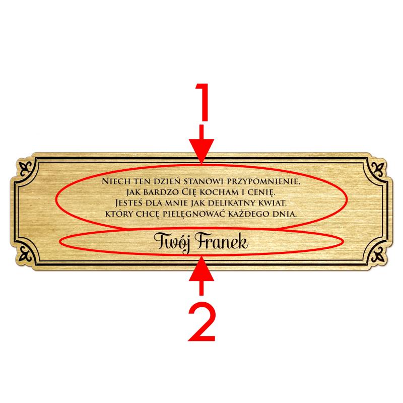 - Grawerowana złota tabliczka z dedykacją wykonana techniką laserową, przyklejona na górze skrzynki, która daje wiele lat trwałości