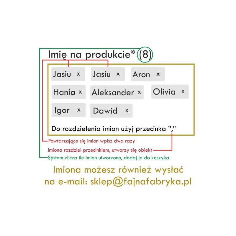 Jeśli masz trudności z wpisaniem imion lub jest ich duża liczba, skontaktuj się z nami sklep@fajnafabryka.pl. Chętnie pomożemy i zapewnimy wsparcie, aby zamówienie przebiegło bezproblemowo.