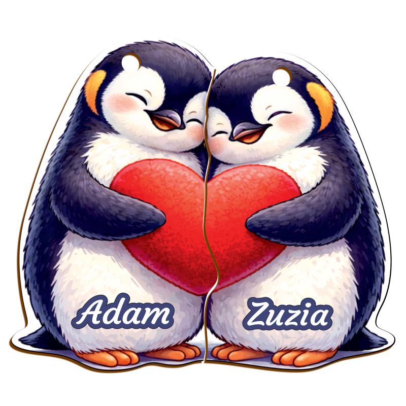 Breloki dla pary to uroczy i symboliczny upominek, który idealnie sprawdzi się na Walentynki lub inną romantyczną okazję. Zestaw przedstawia dwa sympatyczne pingwinki trzymające wspólne serce – każdy brelok stanowi połowę całości, a po połączeniu podkreślają bliskość i więź między dwiema osobami. Dodatkowym, osobistym akcentem jest możliwość umieszczenia imion na każdym breloku.