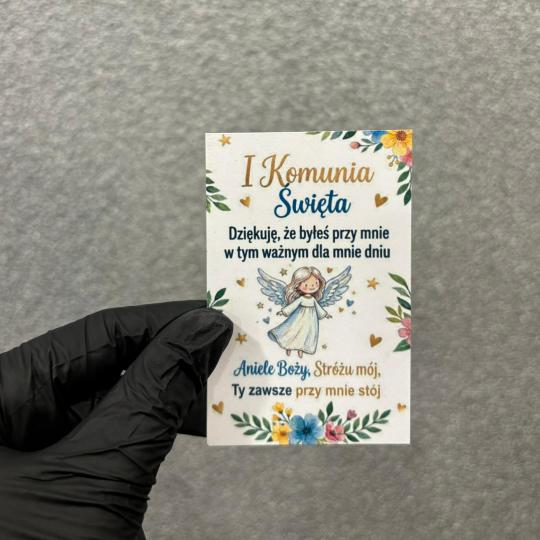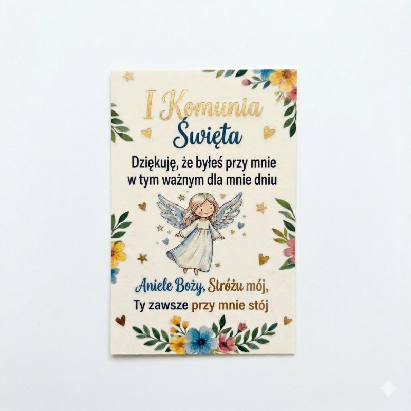 Bilecik na Komunię Świętą z nadrukiem to elegancki i symboliczny dodatek do prezentu, który podkreśla wyjątkowy charakter tej uroczystości. Subtelna grafika z aniołkiem oraz delikatne motywy kwiatowe nadają całości uroczysty i pełen wdzięku wygląd.