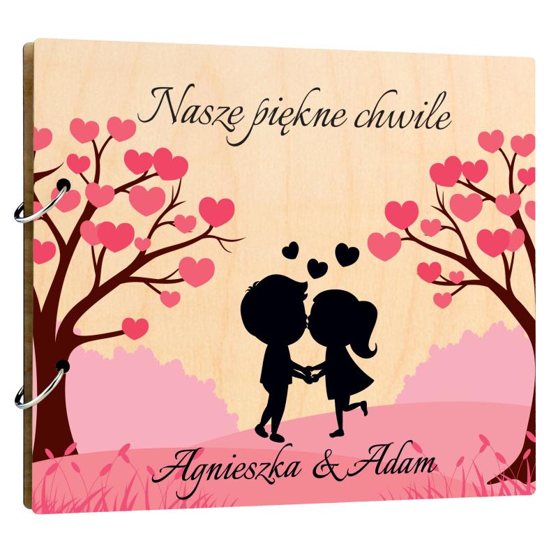 Personalizowany album na zdjęcia w drewnianej okładce z motywem walentynkowym. Dla zakochanych dla niej dla niego album z Twoim podpisem i waszymi imionami. Album ślubny dla nowożeńców. Album z okazji rocznicy.
