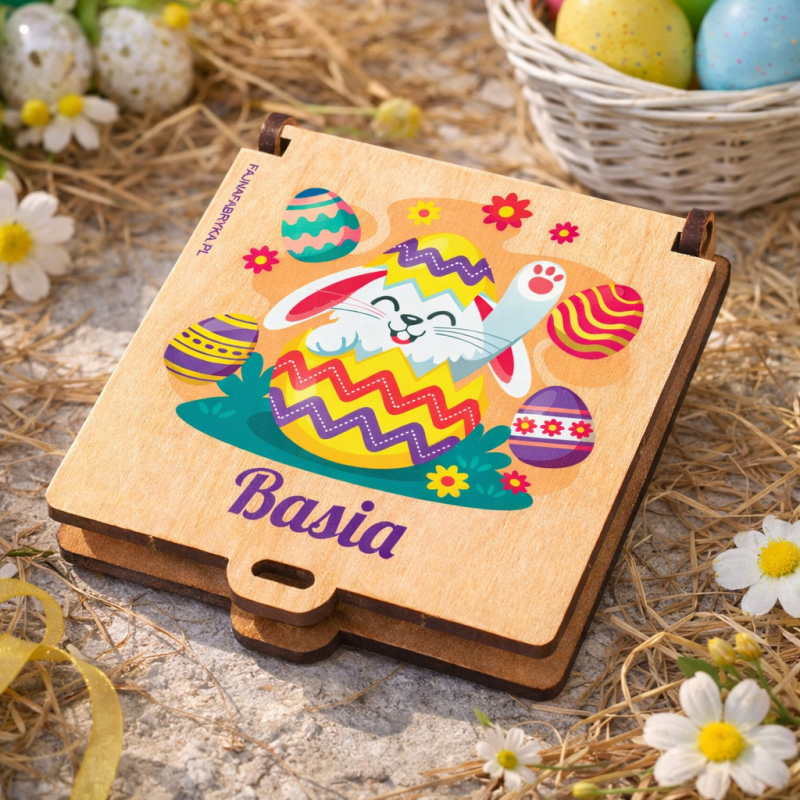 Kolorowa grafika z motywem wielkanocnym oraz nadruk imienia sprawiają, że produkt staje się niepowtarzalny i dopasowany do obdarowanej osoby.
