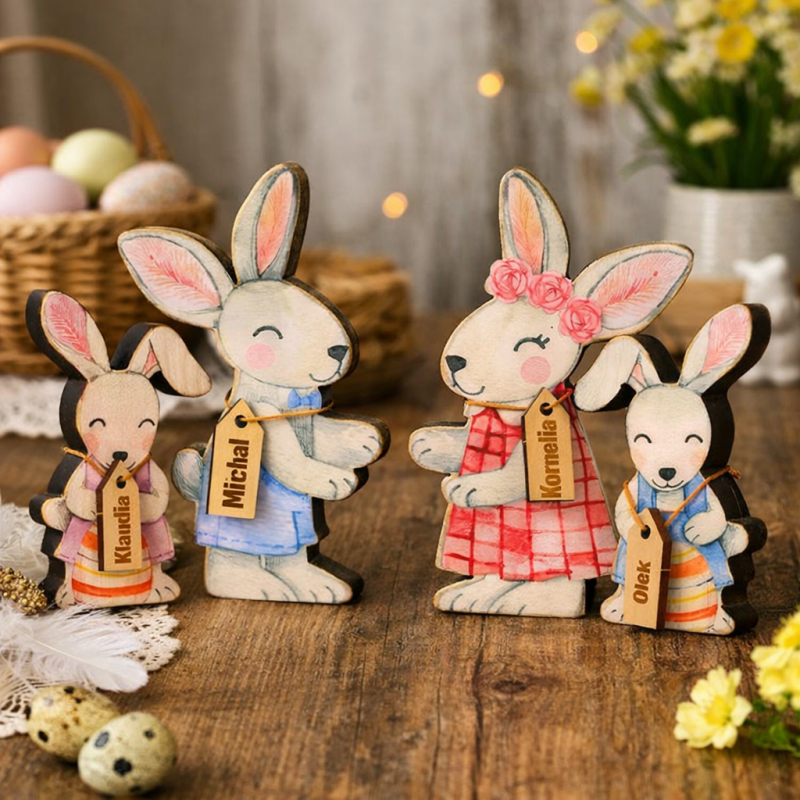 Rodzinka zajączków to personalizowana drewniana ozdoba wielkanocna. Układanka została wykonana z wysokiej jakości drewna o grubości 1,5 cm, z dbałością o detale i wykończenie, które podkreślają naturalne piękno materiału. Każdy element układanki przedstawia członka rodziny.