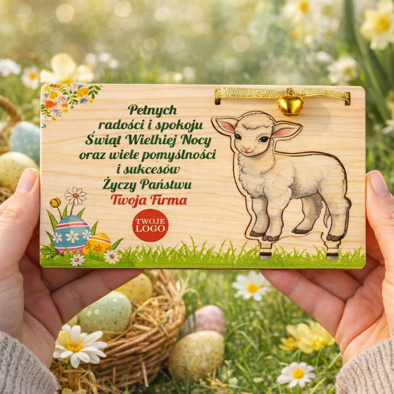Wyjątkowa kartka wielkanocna z przestrzennym, wypinanym elementem 3D w kształcie baranka to elegancka forma przekazania świątecznych życzeń w wersji firmowej.