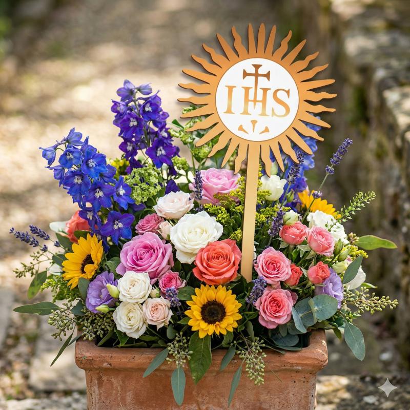 Dekoracyjny topper komunijny IHS do kwiatów to elegancki i symboliczny dodatek, który doskonale podkreśli wyjątkowy charakter uroczystości Pierwszej Komunii Świętej. Motyw hostii z napisem IHS oraz krzyżem stanowi klasyczny element dekoracyjny o głębokim znaczeniu religijnym.