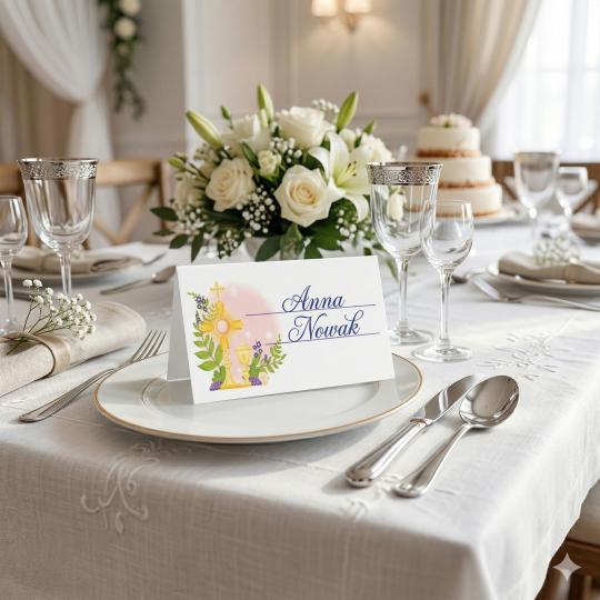 Winietki wykonane są z wysokiej jakości papieru, a ich uniwersalny design doskonale komponuje się z klasyczną aranżacją stołu w stylu komunijnym. Jasna kolorystyka oraz dekoracyjne detale podkreślają wyjątkowy charakter przyjęcia.