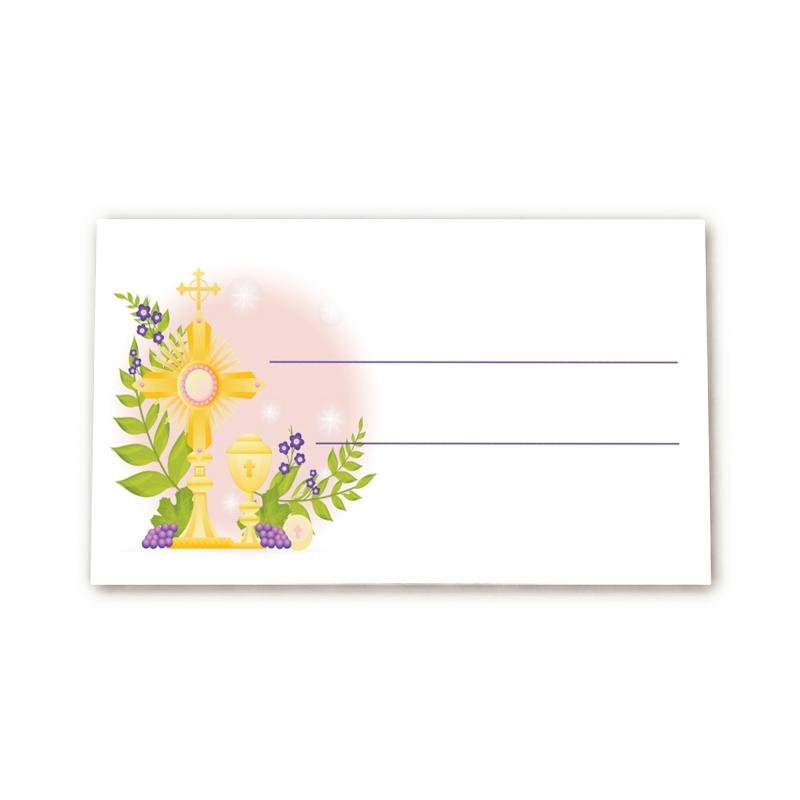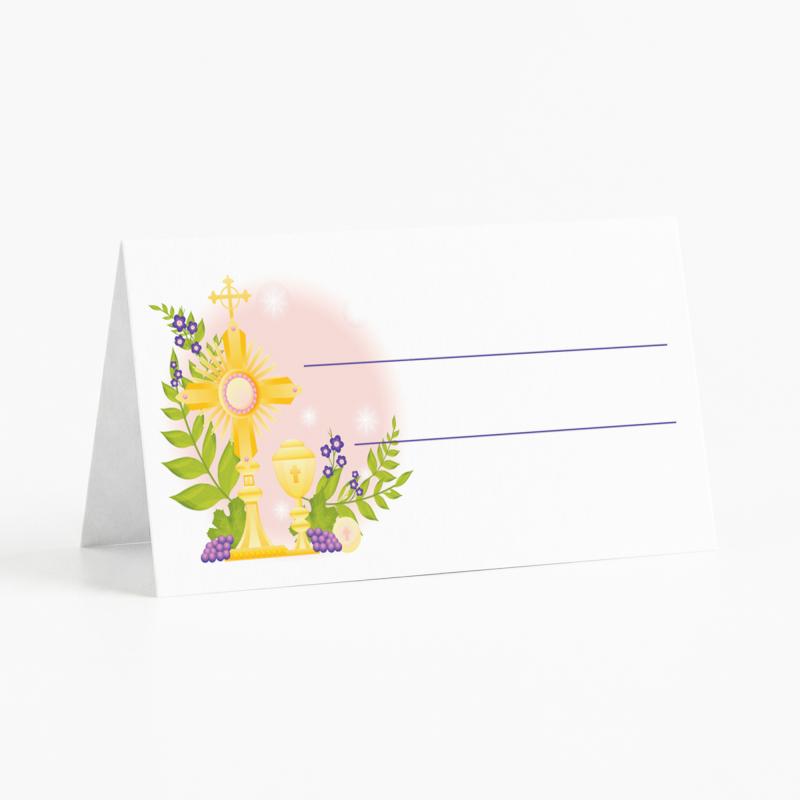 Winietki komunijne do samodzielnego uzupełnienia to elegancki i praktyczny element dekoracji stołu na Pierwszą Komunię Świętą. Delikatny motyw eucharystyczny z kielichem i hostią wprowadza uroczysty i subtelny klimat.
