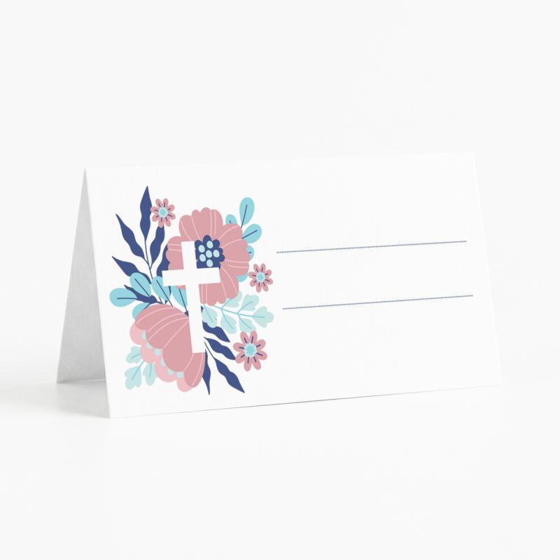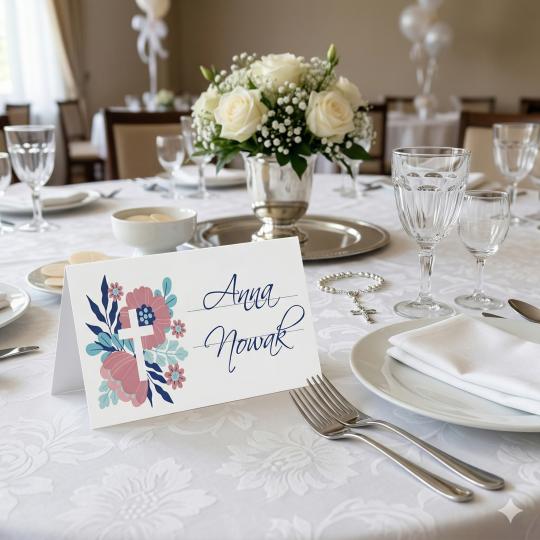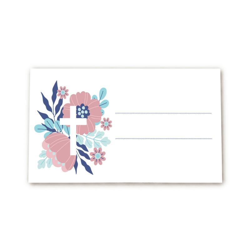 Winietki komunijne z krzyżem i kwiatami do samodzielnego uzupełnienia to subtelna i elegancka dekoracja stołu na Pierwszą Komunię Świętą. Delikatny motyw florystyczny w pastelowych kolorach w połączeniu z symbolem krzyża tworzy wyjątkową, harmonijną kompozycję.