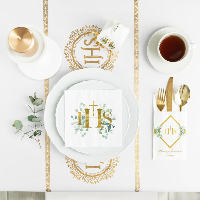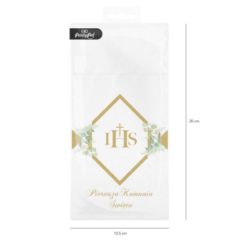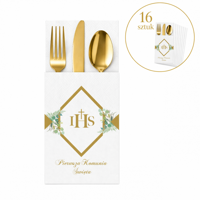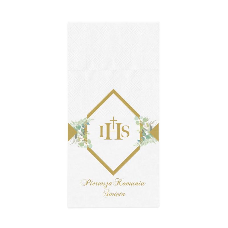 Kieszonki na szt.ućce z ciekawym geometrycznym, złotym wzorem przełamanym delikatnymi zielonymi gałązkami eukaliptusa. Złote napisy zostały umieszczone w centralnej części wzoru - IHS oraz pod głównym motywem - Pierwsza Komunia Święta.
