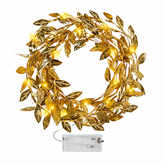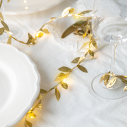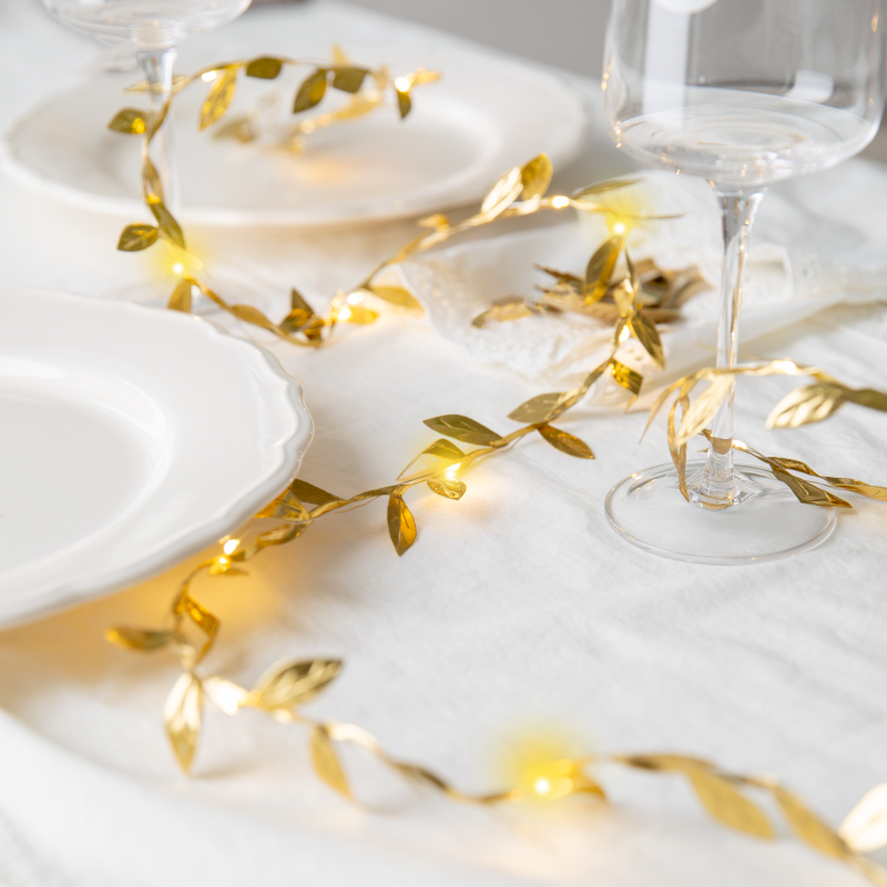 Delikatna girlanda LED z listkami to subtelna dekoracja, która wprowadzi do wnętrza nastrojowy klimat. Malutkie złote listki zostały nawinięte na elastyczny drucik, który pozwala formować girlandę w dowolny kszt.ałt. Dzięki temu z łatwością dopasujesz ją do dekorowanej przestrzeni. Połączenie ledowych lampek z roślinnym motywem sprawdzi się idealnie przy aranżacji świtecznego stołu, wianków czy stroików.