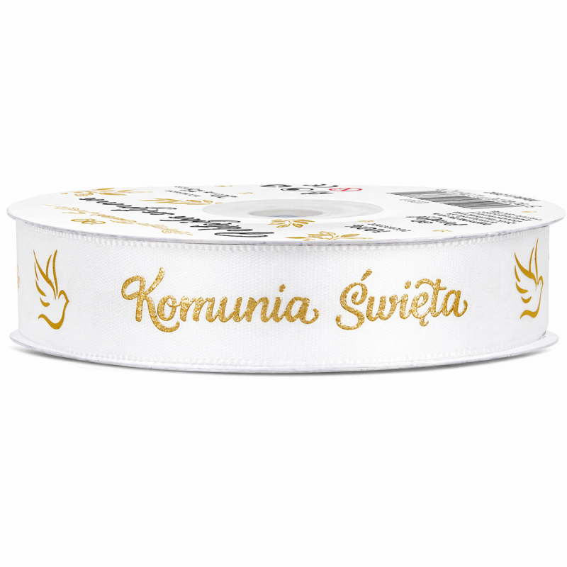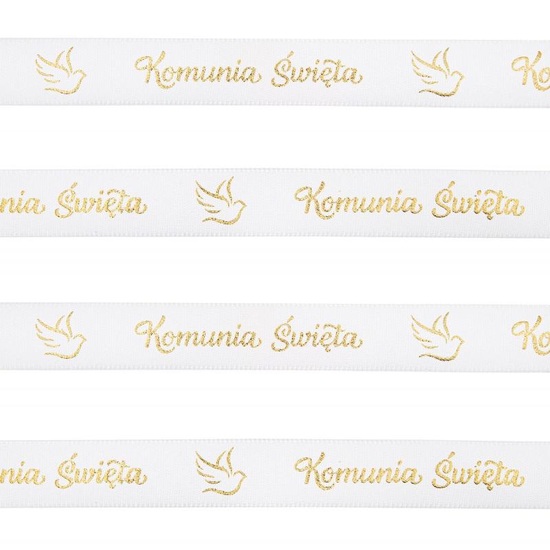 Biała satynowa wstążka ze złotym nadrukiem Komunia Święta i z gołąbkiem. To doskonały element dekoracji prezentów, kwiatów czy stołu komunijnego.