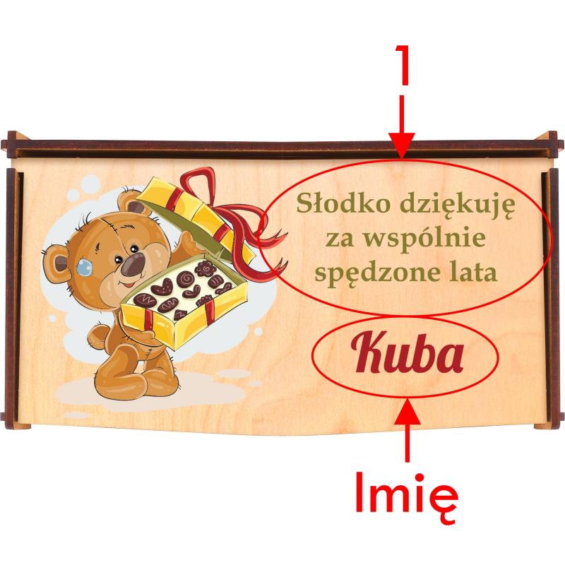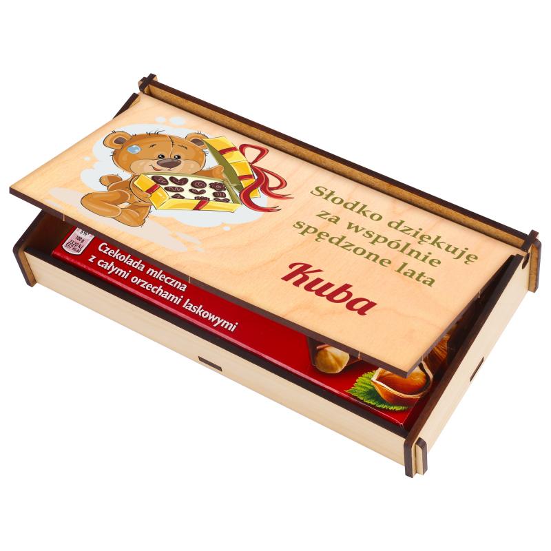 Eleganckie drewniane pudełko na czekoladę z personalizowaną dedykacją to doskonały wybór na prezent z okazji Dnia Kobiet. To wyjątkowy upominek, który łączy w sobie urok, funkcjonalność i osobisty akcent. Na wieczku pudełka znajduje się kolorowa ilustracja uroczego misia, która dodaje całości uroku i podkreśla słodki charakter prezentu.