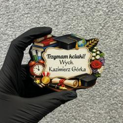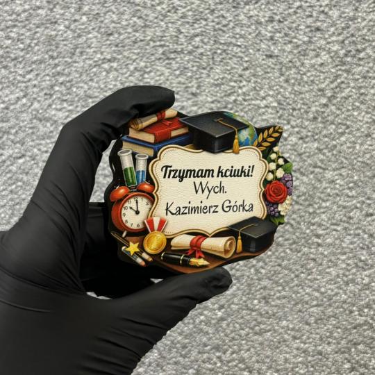 Magnes z nadrukiem na zakończenie szkoły z gratisowym paskiem magnetycznym to wyjątkowa i praktyczna pamiątka, która doskonale sprawdzi się jako prezent dla nauczyciela lub ucznia. Kolorowa grafika z motywami szkolnymi oraz dedykacją „Trzymam kciuki!” nadaje produktowi osobisty i motywujący charakter.