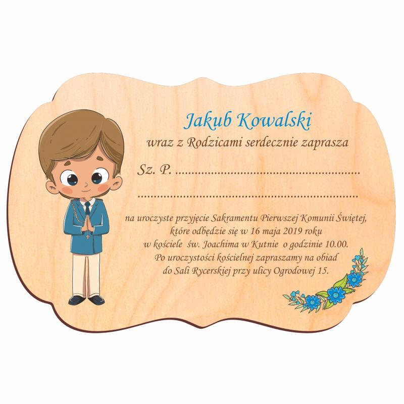 Drewniane zaproszenie na Komunię od chłopca z imieniem
