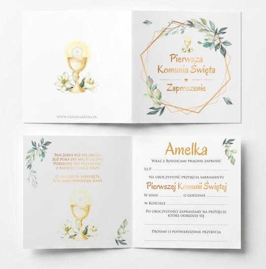 Zaproszenie kwadratowe na Pierwszą Komunię Świętą personalizowane to elegancka i wyjątkowa forma poinformowania bliskich o ważnym wydarzeniu w życiu dziecka.
